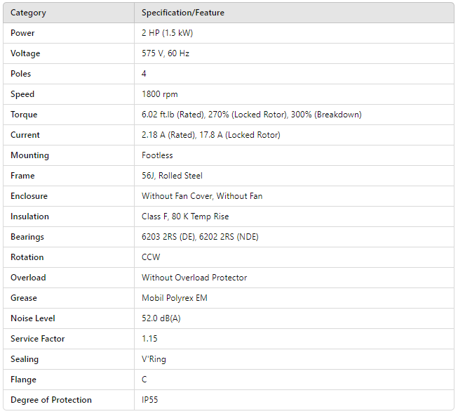 Torque 6.02 ft.lb (Rated), 270% (Locked Rotor), 300% (Breakdown)