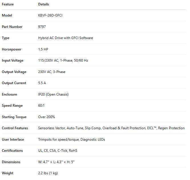 KBVF-26D-GFCI, Hybrid AC Drive 1.5Hp 5.5A 115/230V 1PH Input 230V 3PH output IP20 Chassis W/ GFCI Software is backordered and will ship as soon as it is back in stock.