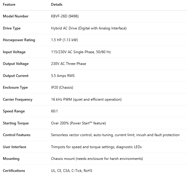9496, (KBVF-26D) Hybrid AC Drive 1.5Hp 5.5A 115/230V 1PH Input 230V 3PH output IP20 Chassis