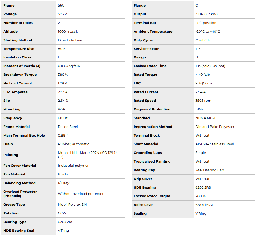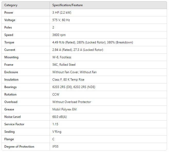 Torque 4.49 ft.lb (Rated), 280% (Locked Rotor), 380% (Breakdown)