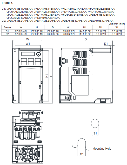 MS-VFD7A5MS21AFSAA, (MS300) 2Hp (HD 7.65A) / 3Hp (ND 10.2A), 1 Ø 230VAC, 0-599.0Hz (op), (V/Hz, SVC, PM), c/w EMI filter, IP20 Frame C2