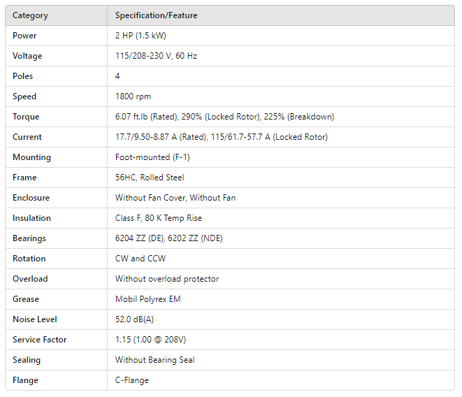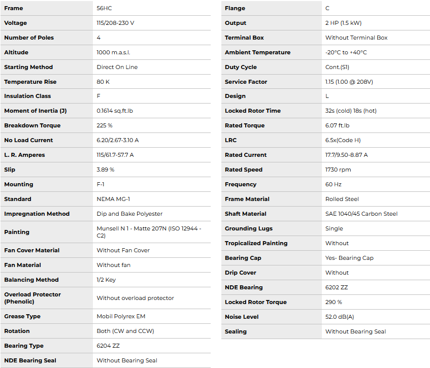 Torque 6.07 ft.lb (Rated), 290% (Locked Rotor), 225% (Breakdown)