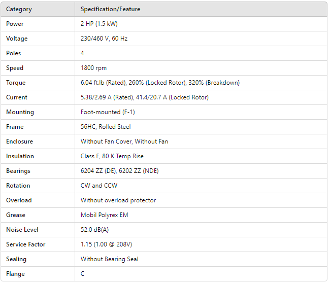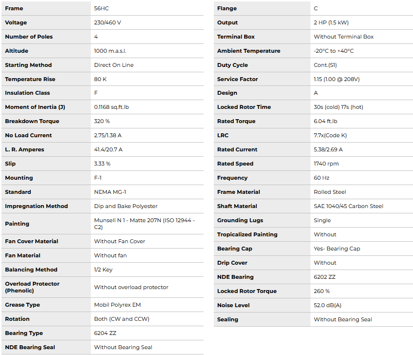 Torque 6.04 ft.lb (Rated), 260% (Locked Rotor), 320% (Breakdown)