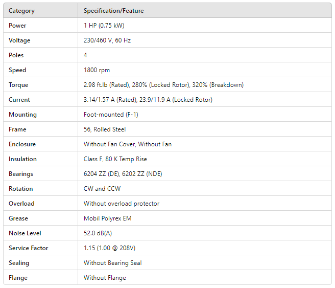 OF000404W01DOE, Rolled Steel Premium Efficiency 1Hp 1760 Rpm 4P 56 3Ph 230/460//190-220/380-415 V 60 Hz IC01 - ODP - Foot-mounted is backordered and will ship as soon as it is back in stock.