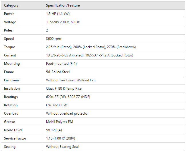 OF001102W01DOE, Rolled Steel 1.5Hp 3500 Rpm 2P 56 1Ph 115/208-230 V 60 Hz IC01 - ODP - Foot-mounted