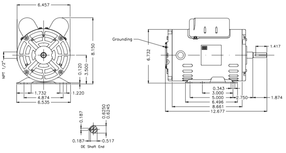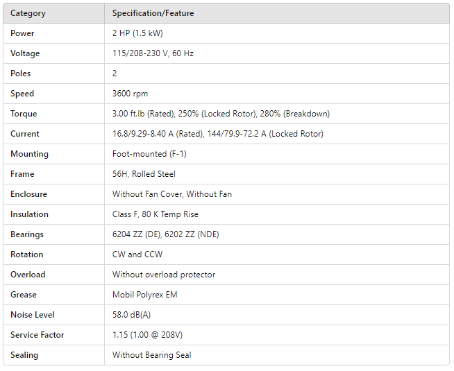 Torque 3.00 ft.lb (Rated), 250% (Locked Rotor), 280% (Breakdown)