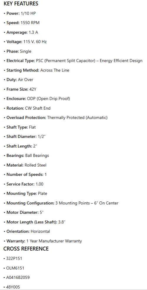 OLM6151, OEM Replacement, 1/10Hp, 1550 RPM, 115V, CWSE, ODP, Fr. 42Y