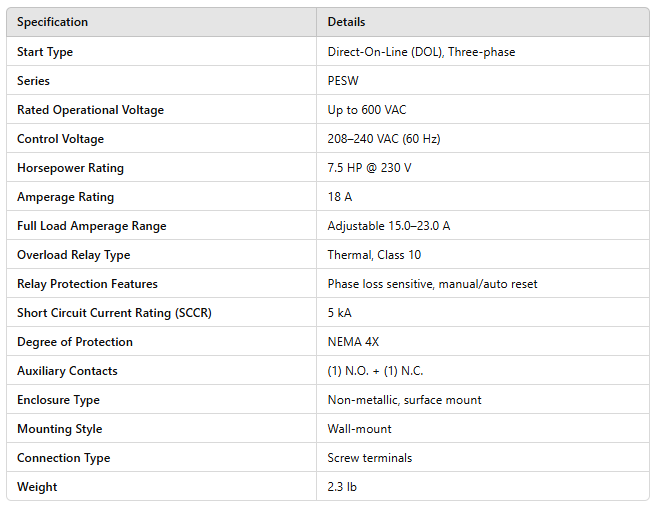 PESW-B18V24EX-R67, Enclosed Starter, 7.5Hp@230, 208-240 V Coil with Stop-Reset Pushbuttons - Three Phase, 14655231 is backordered and will ship as soon as it is back in stock.