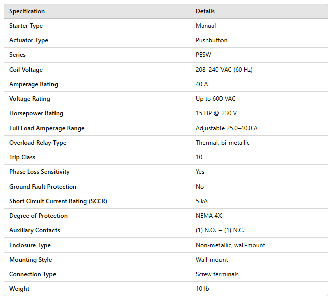 PESW-B40V24EX-R70, Enclosed Starter, 15Hp@230, 208-240 V Coil with Stop-Reset Pushbuttons - Three Phase, 14971346