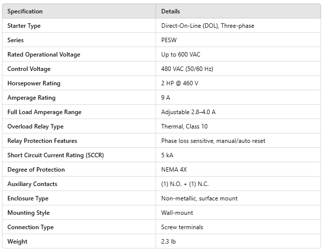 PESW-B9D39AX-R60, Enclosed Starter, 2Hp@460, 480 V Coil with Start-Stop Pushbuttons - Three Phase, 13438798 is backordered and will ship as soon as it is back in stock.