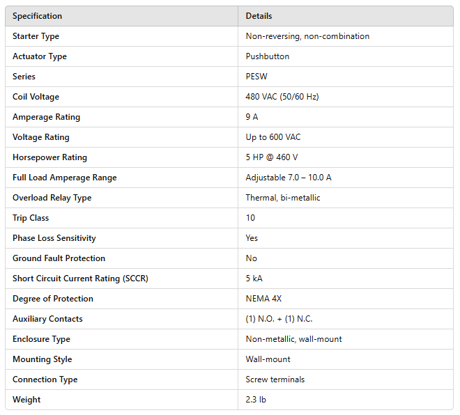 PESW-B9D39AX-R63, Enclosed Starter, 5Hp@460, 7.0 – 10.0 A, 480 V Coil with Start-Stop Pushbuttons - Three Phase, 13438801