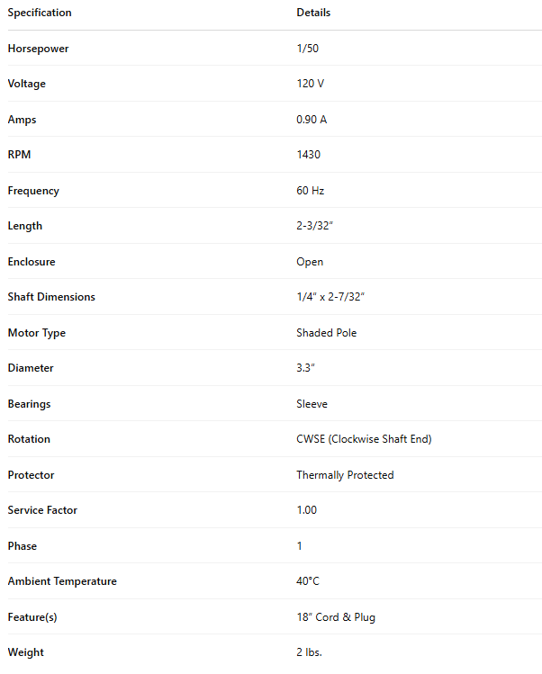 SS319, Exhaust Fan Motor, 3.3" Dia, 1/50Hp, 0.9Amp, 120V, 1430Rpm
