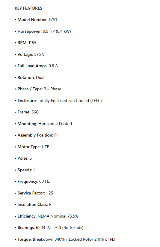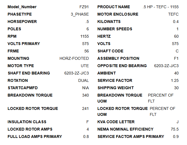 U12P3GC, 1/2Hp, 1155 RPM, 575V, 3PH, 60Hz, TEFC, Frame 56C, FZ91