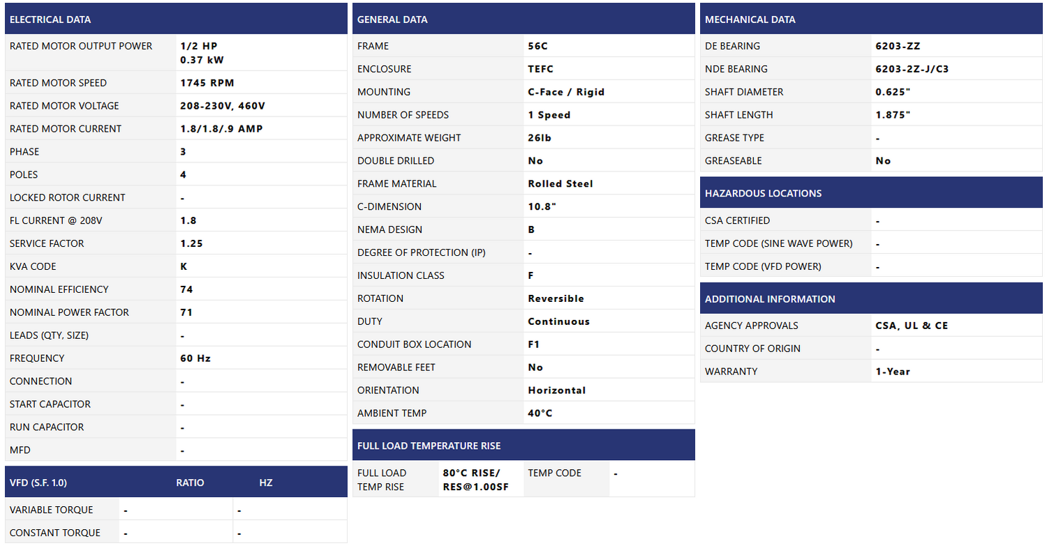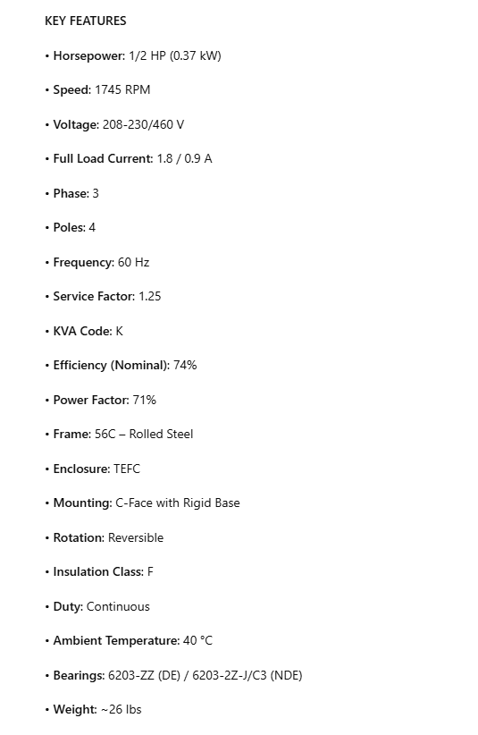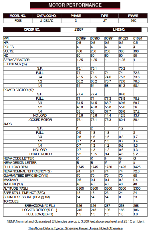 U12S2AC, 1/2Hp, 1745 RPM, 208-230/460V, 3PH, 60Hz, TEFC, Frame 56C, F008