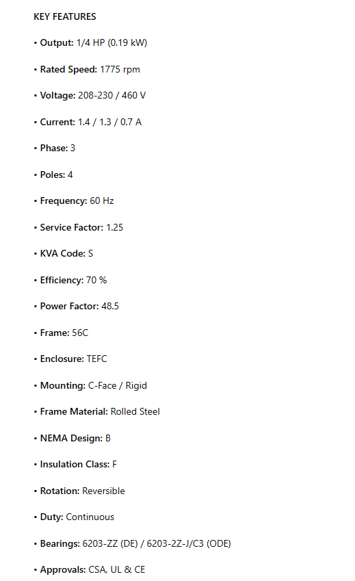 U14S2AC, 1/4Hp, 1775 RPM, 208-230/460V, 3PH, 60Hz, TEFC, 56C, Steel Edge, NEMA Premium ,ROLLED STEEL RIGID BASE