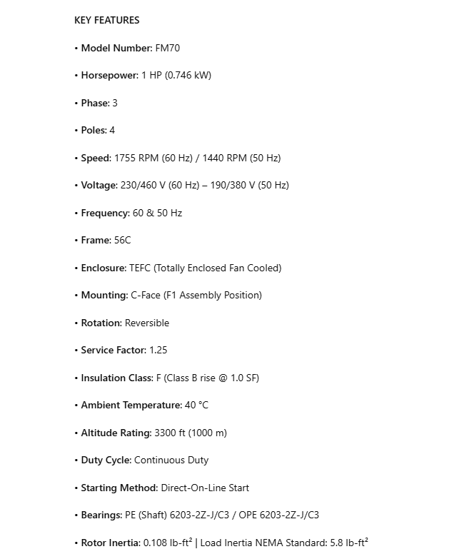 U1P2DFC, 1Hp, 1755 RPM, 208-230/460V, 3PH, 60-50Hz, TEFC, Frame 56C, FM70 is backordered and will ship as soon as it is back in stock.