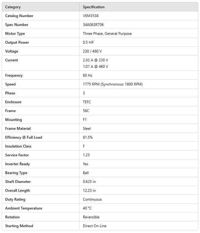 VEM3538, Baldor, 1/2 Hp, 1720 Rpm, 230/460V,35J302G155,TEFC,Round Body, 34A063R706 is backordered and will ship as soon as it is back in stock.