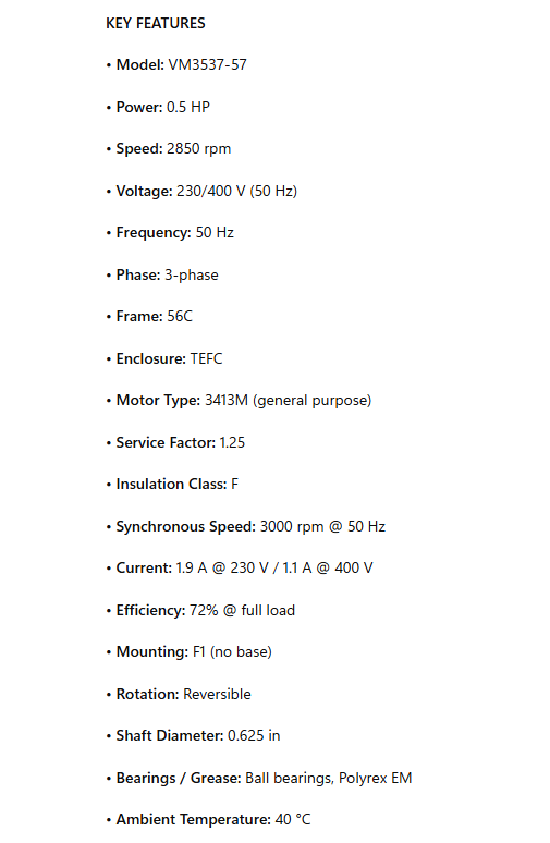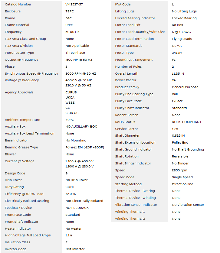VM3537-57, 0.5Hp, 2850RPM, 230/460V, 3Ph, 50Hz, Frame 56C, Ip44, 34A063X538G1 is backordered and will ship as soon as it is back in stock.