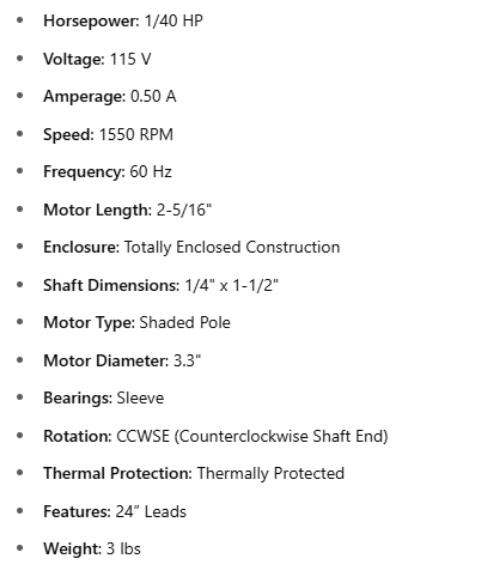 2868-407-010, Electrohome, 1/40Hp, 1550 Rpm, 115V, Frame: 3.3 Tefc,