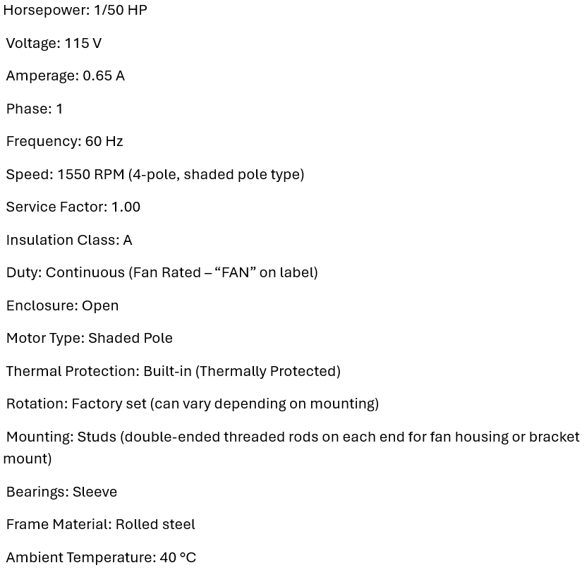 • Speed: 1550 RPM (4-pole, shaded pole type)