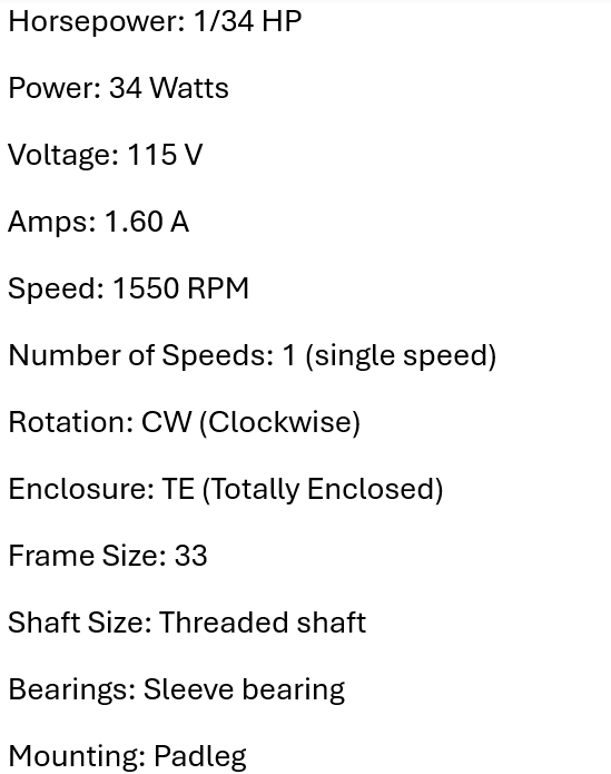 • Horsepower: 1/34 HP