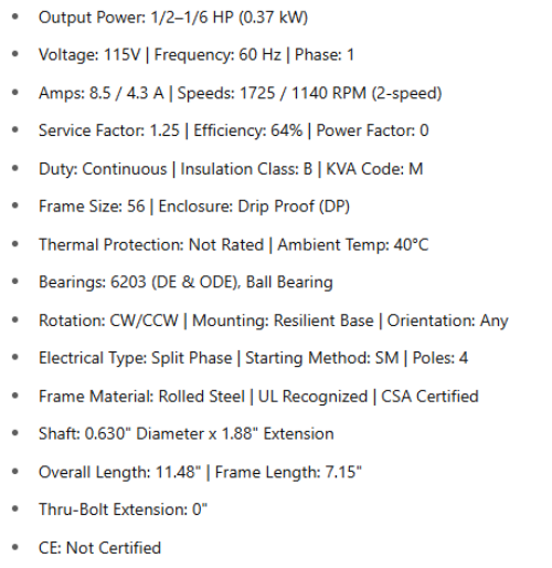 Amps: 8.5 / 4.3 A | Speeds: 1725 / 1140 RPM (2-speed)