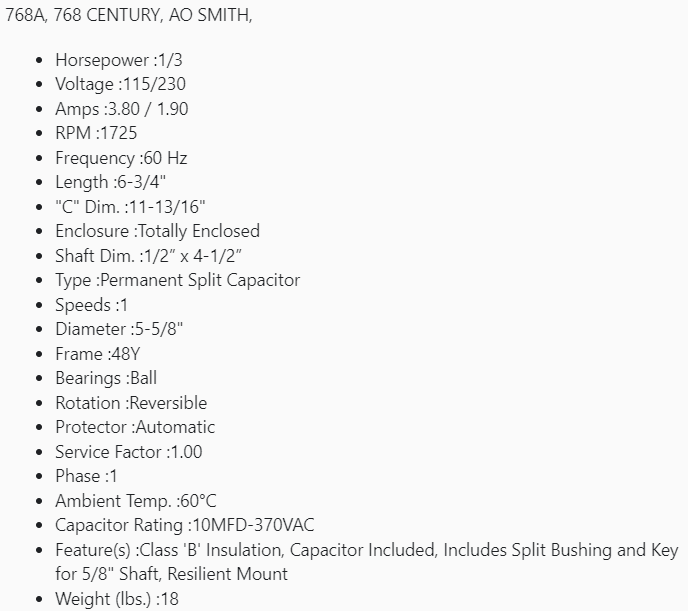 768A, century, 768, 1/3 hp,1725 rpm, 115/230v,FR:48 ,tenv, exhaust fan is backordered and will ship as soon as it is back in stock.
