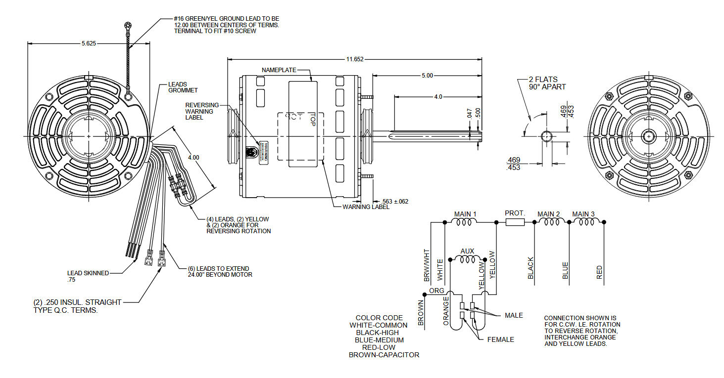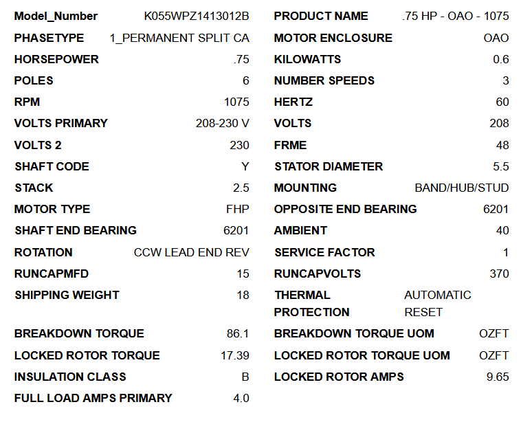 8905, Us Motors, 3/4HP, 1075 RPM, 3SPD, 208-230V, K055WPZ1413012B, Fr:48, HVAC