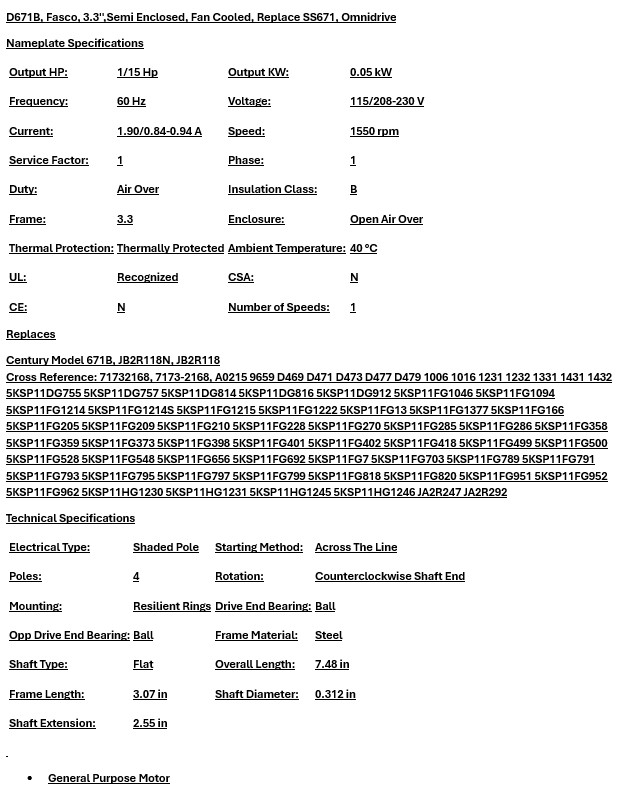 D671B, Fasco, 3.3'',Semi Enclosed, Fan Cooled, Replace SS671, Omnidrive