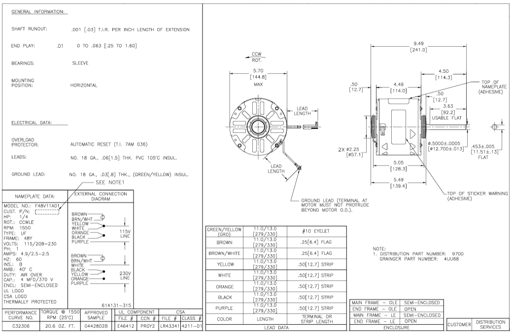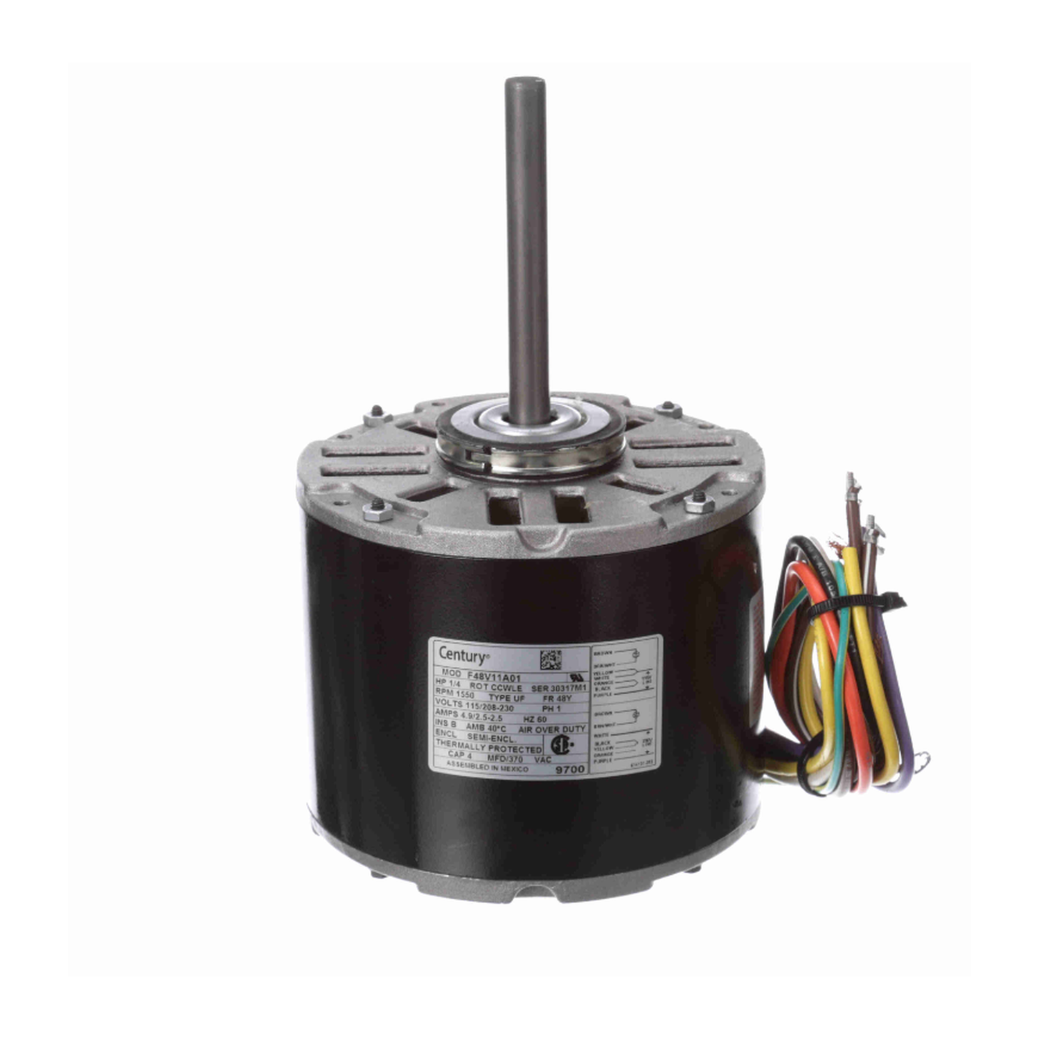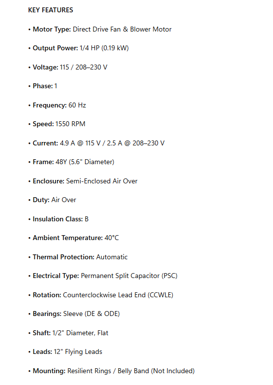 9700, Fan and Blower Motor, 1/4Hp, 1550 RPM, 115/208/230V, 1Ph, 60Hz, Frame 48Y, 1 Speed, semi Enclosed , F48V11A01