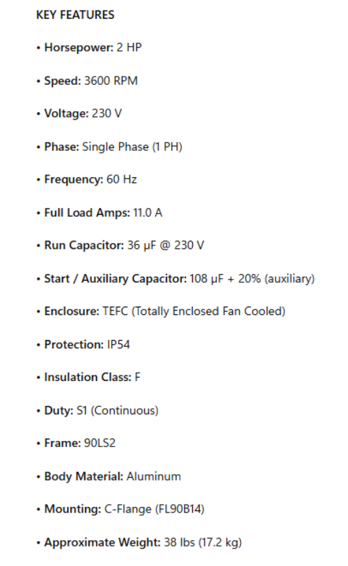 LM90LS2-230-B14, 2Hp, 3600RPM, 230V, 1PH, 60Hz, TEFC, IP54, Frame 90LS2, C-Flange
