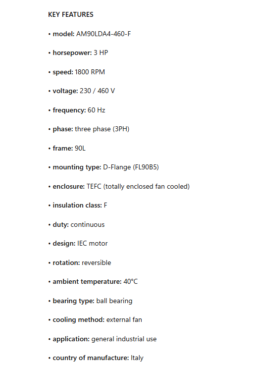 AM90LDA4-460-F, 3Hp, 1800 RPM, 230/460V, 3Ph, 60Hz, Frame 90L, TEFC, Class F, D-Flange