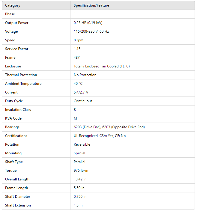C4C17FZ24C, LEESON Parallel Shaft Gearmotor, 0.25Hp, 1 Ph, 60 Hz, 115/208-230 V, 8 RPM, 48Y Frame, TEFC - 107000.00