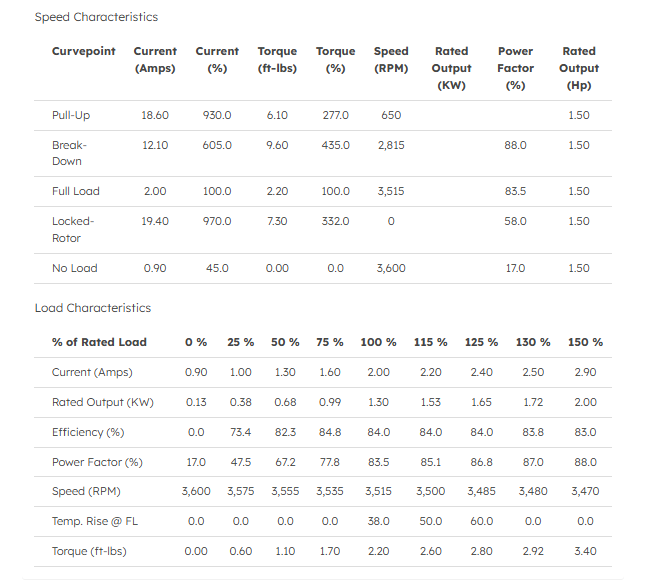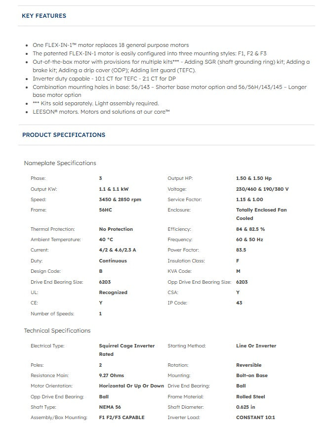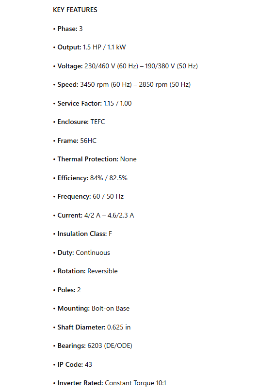 • Output: 1.5 HP / 1.1 kW