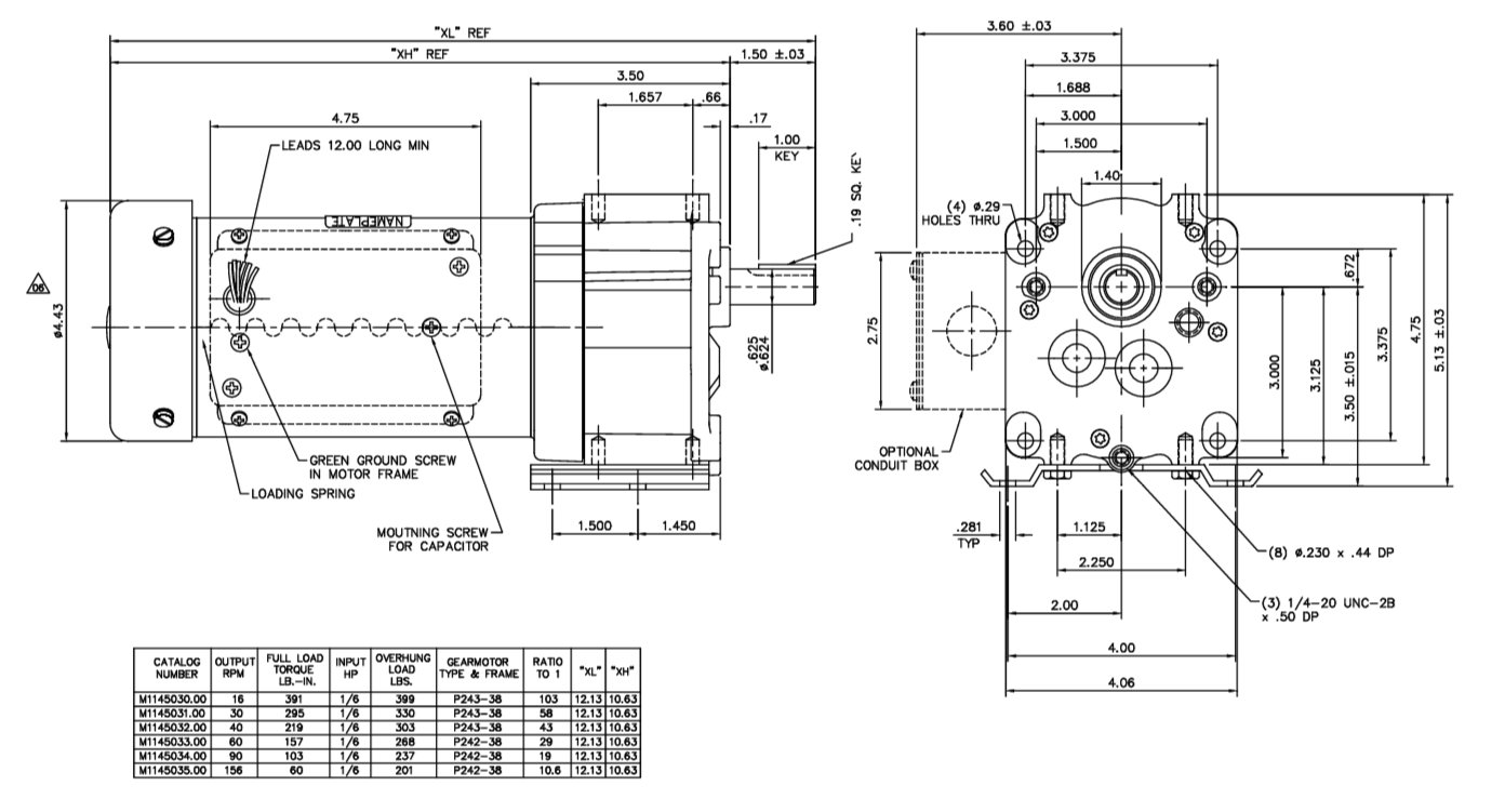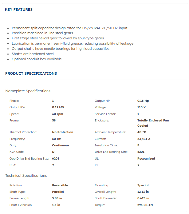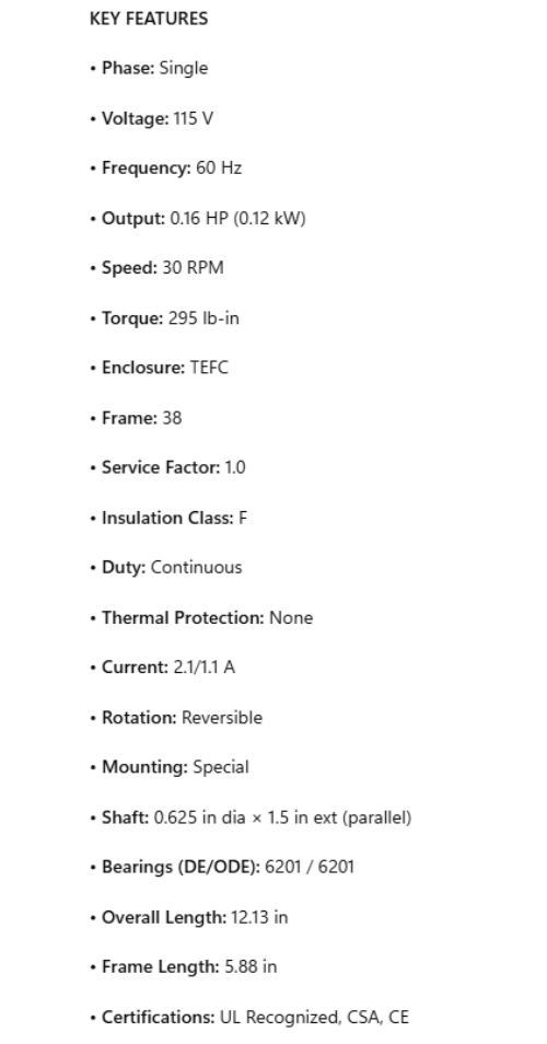 • Shaft: 0.625 in dia × 1.5 in ext (parallel)
