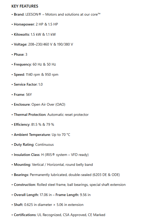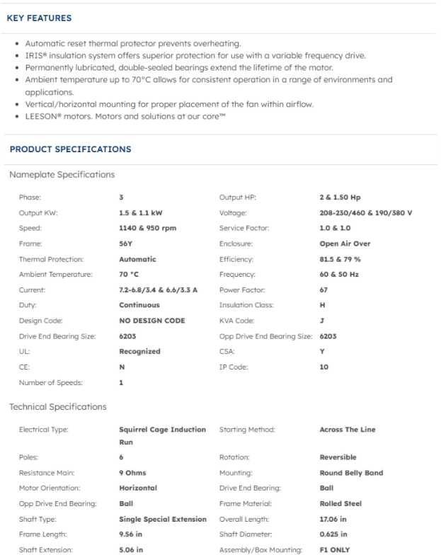 X509, Condenser Fan Motor, 2 & 1.5Hp, 3 Ph, 60 & 50 Hz, 208-230/460 & 190/380 V, 1200 & 1000 RPM, 56Y Frame, OPAO, 56T11O5304H