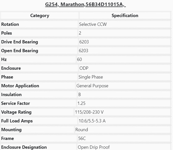 G254A, Marathon, 1Hp, 3450 Rpm, 115/208-230 Volts, Frame: 56c, Drip Proof, is backordered and will ship as soon as it is back in stock.