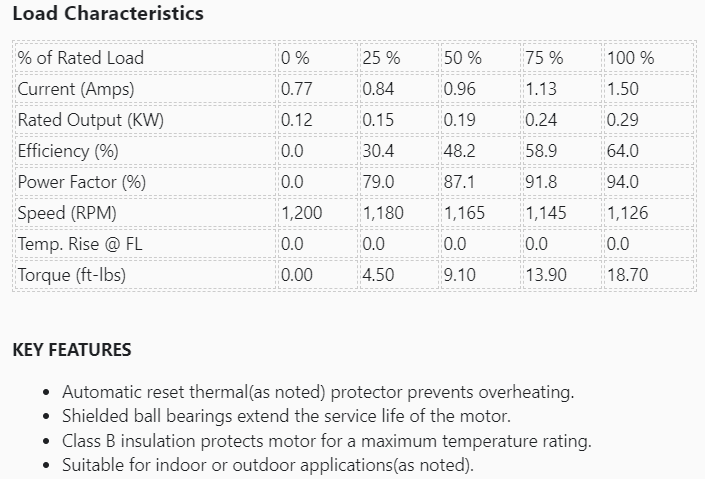 Phase: | 1 | Output HP: | 0.25 Hp |