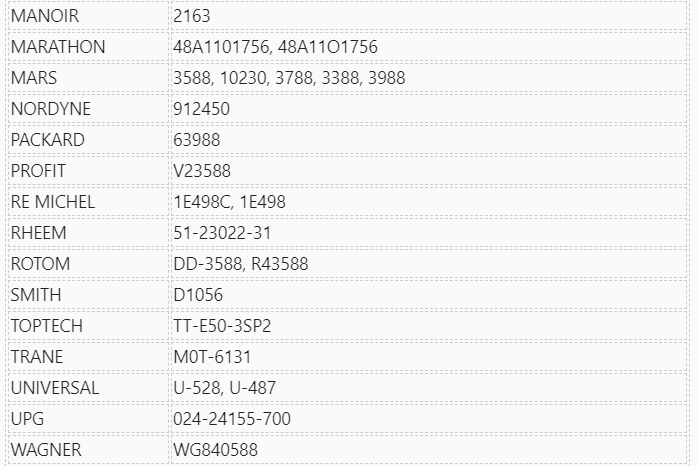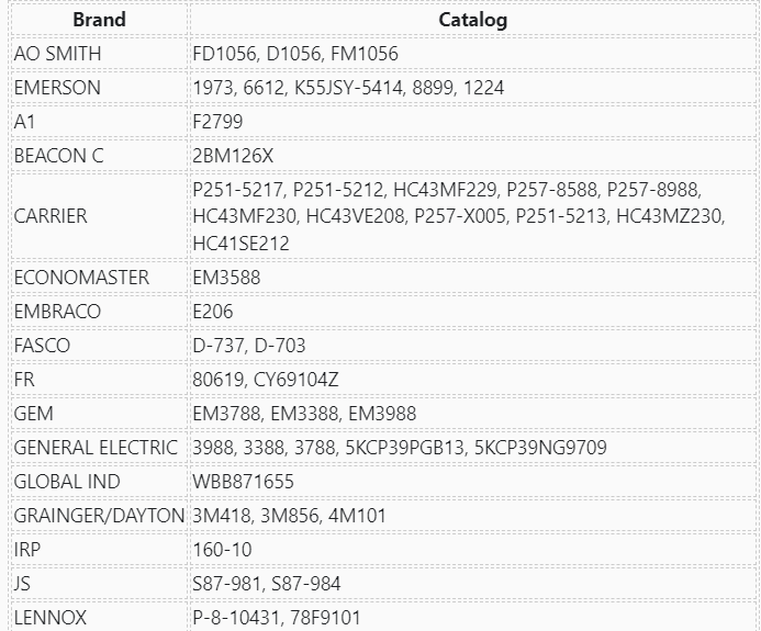 X005,Marathon,FD1056 Us Motors,K055WMM1258012B, 1973, 6612, K55JSY-5414, 8899, 1224,P251-5217, P251-5212, HC43MF229, P257-8588, P257-8988, HC43MF230, HC43VE208, P257-X005, P251-5213, HC43MZ230, HC41SE212,3988, 3388, 3788, 5KCP39PGB13, 5KCP39NG9709,48A1101756, 48A11O1756,U-528, U-487 Trane, 3588, 10230, 3788, 3388, 3988,