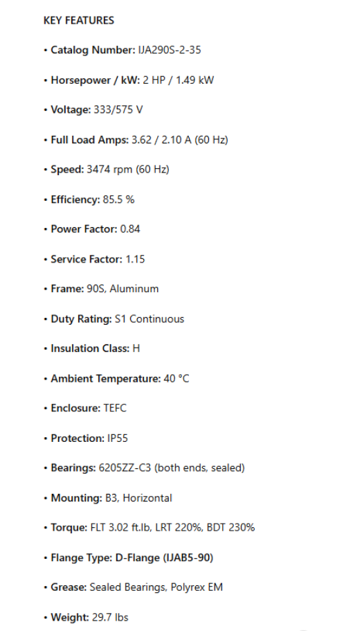 IJA290S-2-35D, 2Hp, 3600 RPM, 333/575V, 3PH, 60Hz, TEFC, Frame 90S, IP55, D-Flange