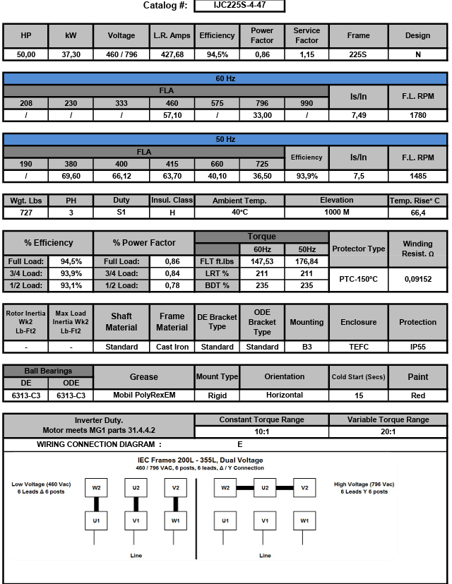 IJC225S-4-47, 50Hp, 460/796V, 3Ph, 60/50Hz, TEFC, IP55, 10:1 CT~20:1 VT