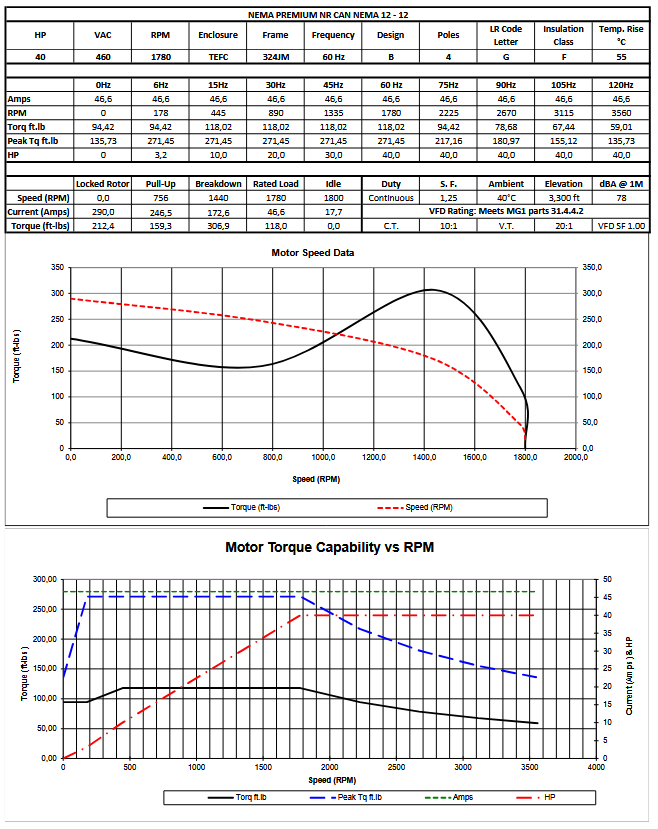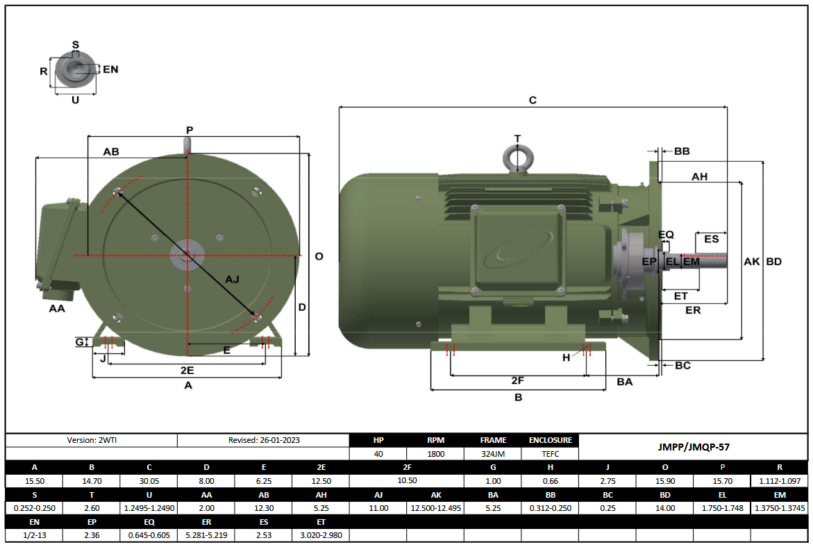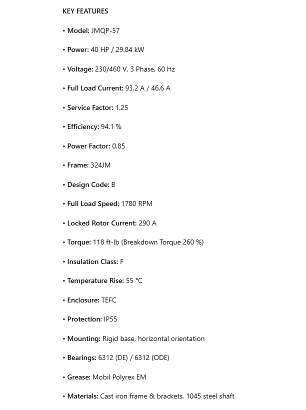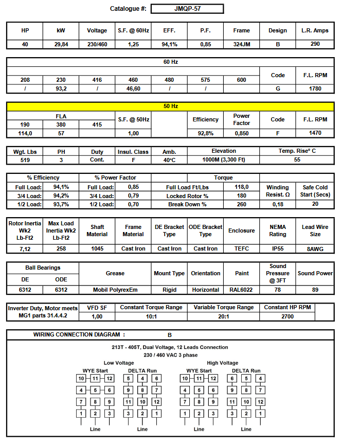 JMQP-57, 40Hp, 1780RPM, 208-230/460V, 3Hp, 60-50Hz, TEFC, Frame 324JM