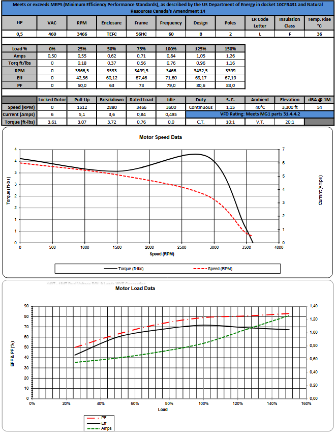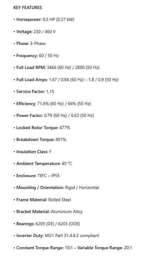 • Full Load RPM: 3466 (60 Hz) / 2880 (50 Hz)