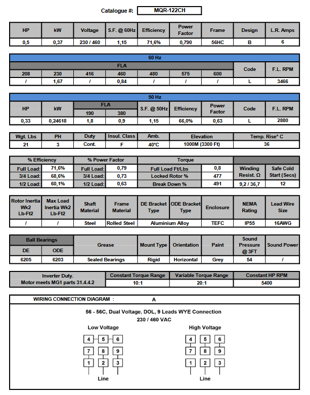 MQR-122CH, 1/2Hp, 3466 RPM, 208-230/460V, 3PH, 60Hz, TEFC, Frame 56C, 10:1 CT ~ 20:1 VT, DIV2, IP55, CLASS F