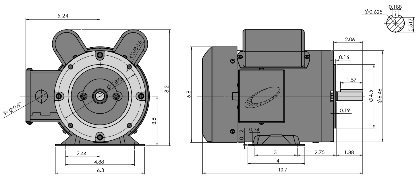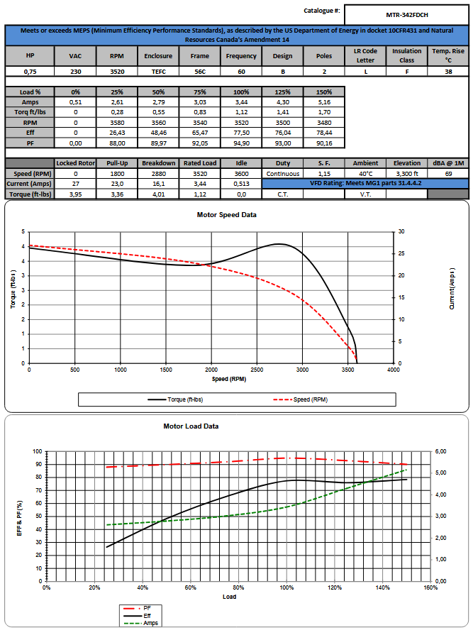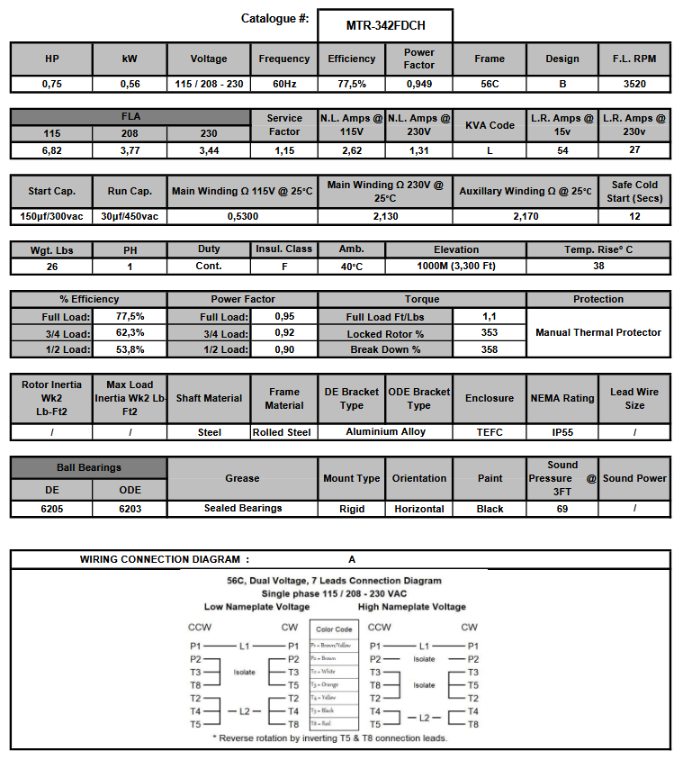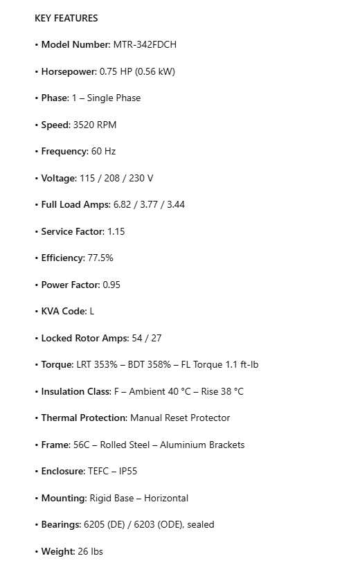 MTR-342FDCH, 3/4Hp, 3520 RPM,  115/230V, 1Ph, 60Hz, TEFC, 56C, IP55