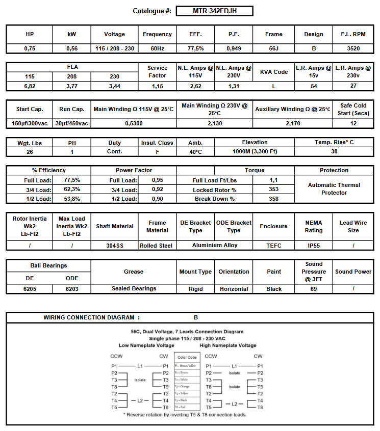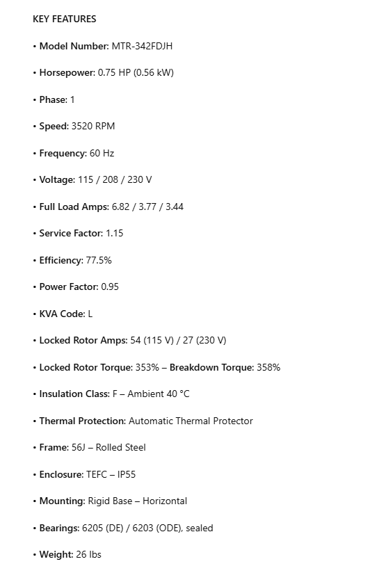 MTR-342FDJH, 3/4Hp, 3520 RPM, 115/230V, 1PH, 60/50Hz, TEFC, Frame 56J, IP55, AUTO OVERLOAD