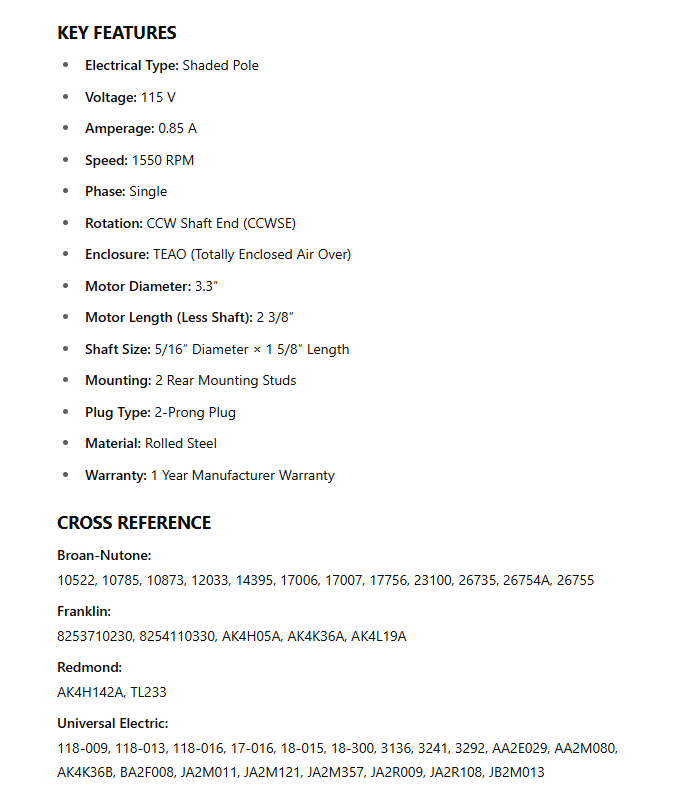 26754A, OEM Replacement, 115V, 1550 RPM , TEAO, 3.3″