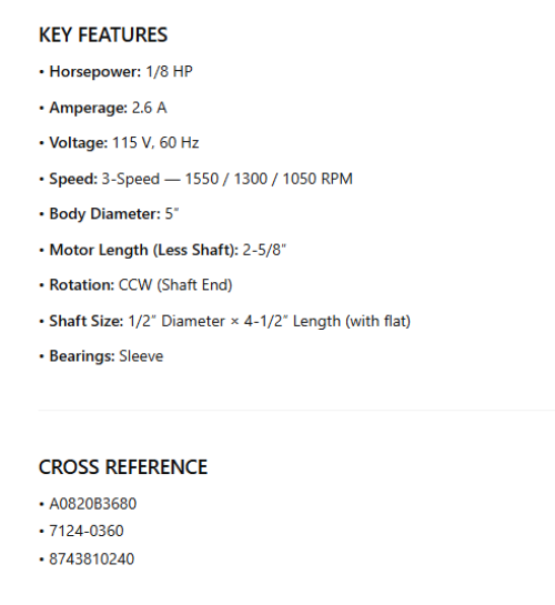 308318M, OEM Replacement, 1/8Hp, 1550 / 1300 / 1050 RPM, 115V, CCWSE