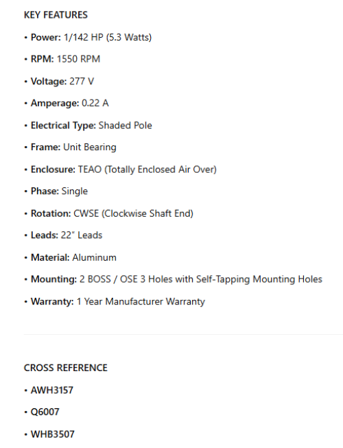 3900-2010-001A, OEM Replacement, 1/142Hp, 1550 RPM, 277V, 1 PH, TEAO, CWSE is backordered and will ship as soon as it is back in stock.