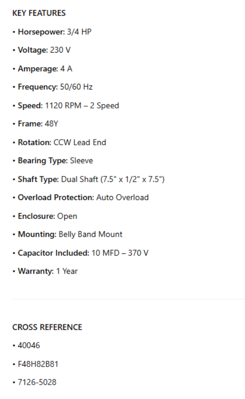 40046, OEM Replacement, 3/4Hp, 230V, 1120 RPM, Fr. 48Y, CCWLE